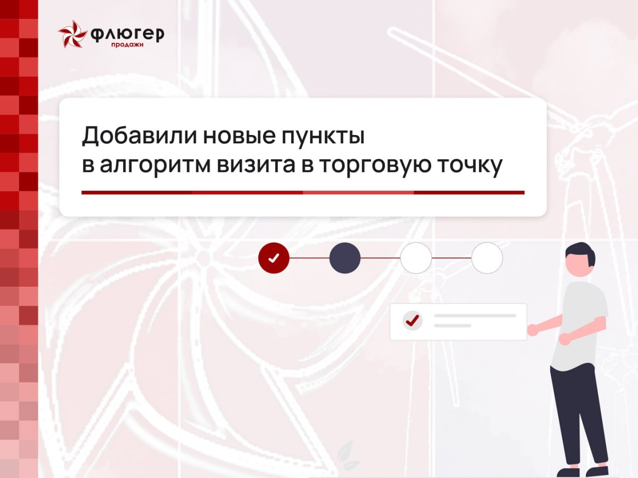 Мы добавили новые пункты в алгоритм визита в торговую точку в мобильном приложении «Флюгер-Продажи»: Опросы, Фотоотчеты и Рекламная активность.
