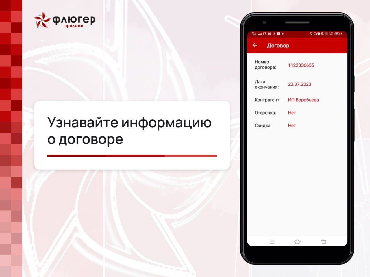 В приложении «Флюгер-Продажи» торговый представитель легко получает полную информации о договоре в разделе «Реестр договоров».